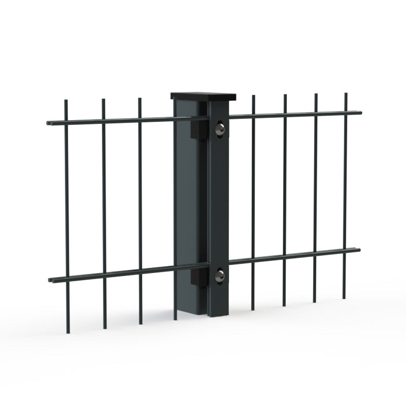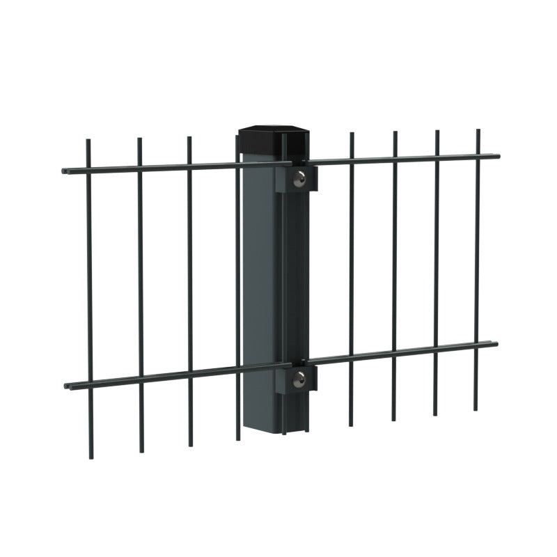 Das System 2D1 und 2D2 wird mit Schrauben an den Pfosten befestigt, mit einer Kunststoffunterlage und einer Stahl-Frontplatte. Sie unterscheiden sich in der Anzahl der Befestigungspunkte. 2D1 hat 4 Befestigungspunkte (je nach Höhe des Pfostens), das System 2D2 hat einen Befestigungspunkt für jedes horizontale Segment.