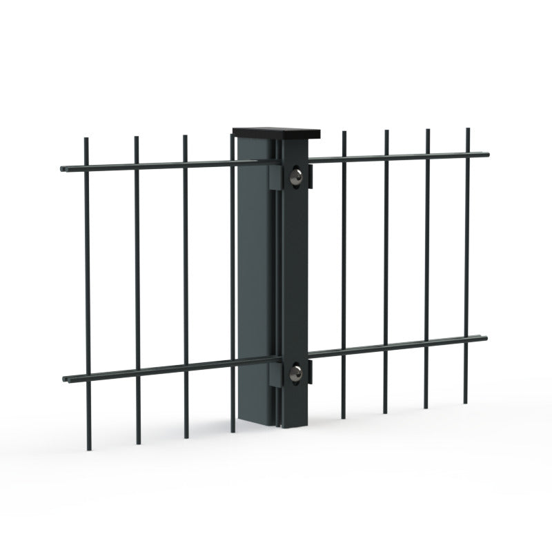 Das System Pfosten mit Abdeckleiste Stahl 1 wird ebenfalls mit Schrauben an den Pfosten befestigt, jedoch mit Stahlunterlagen und einer Stahl-Frontplatte. Das System hat einen Befestigungspunkt für jedes horizontale Segment.
