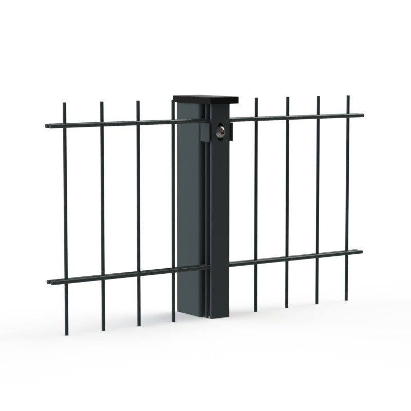 Das System Pfosten mit Abdeckleiste Stahl 2 wird mit Schrauben an den Pfosten befestigt, jedoch mit Stahlunterlagen und einer Stahl-Frontplatte.